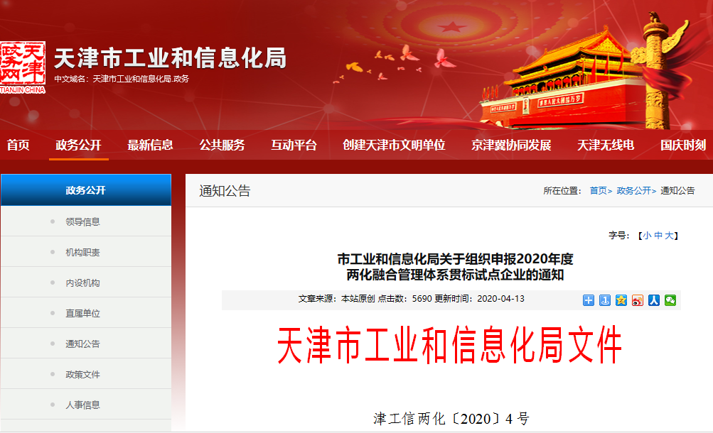 近日,天津市工信局发布《市工业和信息化局关于组织申报2020年度两化融合管理体系贯标试点企业的通知》,对两年内通过两化融合管理体系评定且获得证书的试点企业,给予一次性资金补贴。申报时间为2020年5月15日前。
